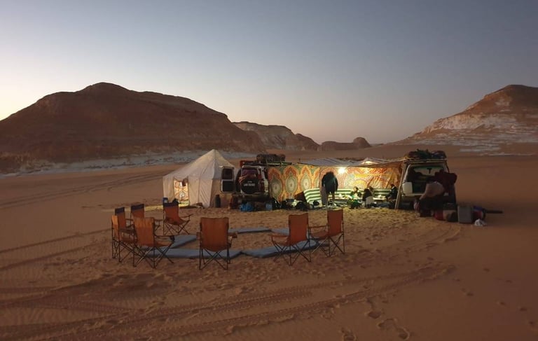 Arrive in Bawiti, the capital of the oasis, with transfer from the hill to the hotel (safari camp). black rocks. You will hike to explore Gabal el Marsos (divided mountain) and then drive to the small Bedouin village of El Hez with an al fresco lunch. On the 160km on/off road journey to the White Desert, you will pass Crystal Mountain and